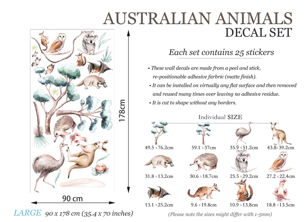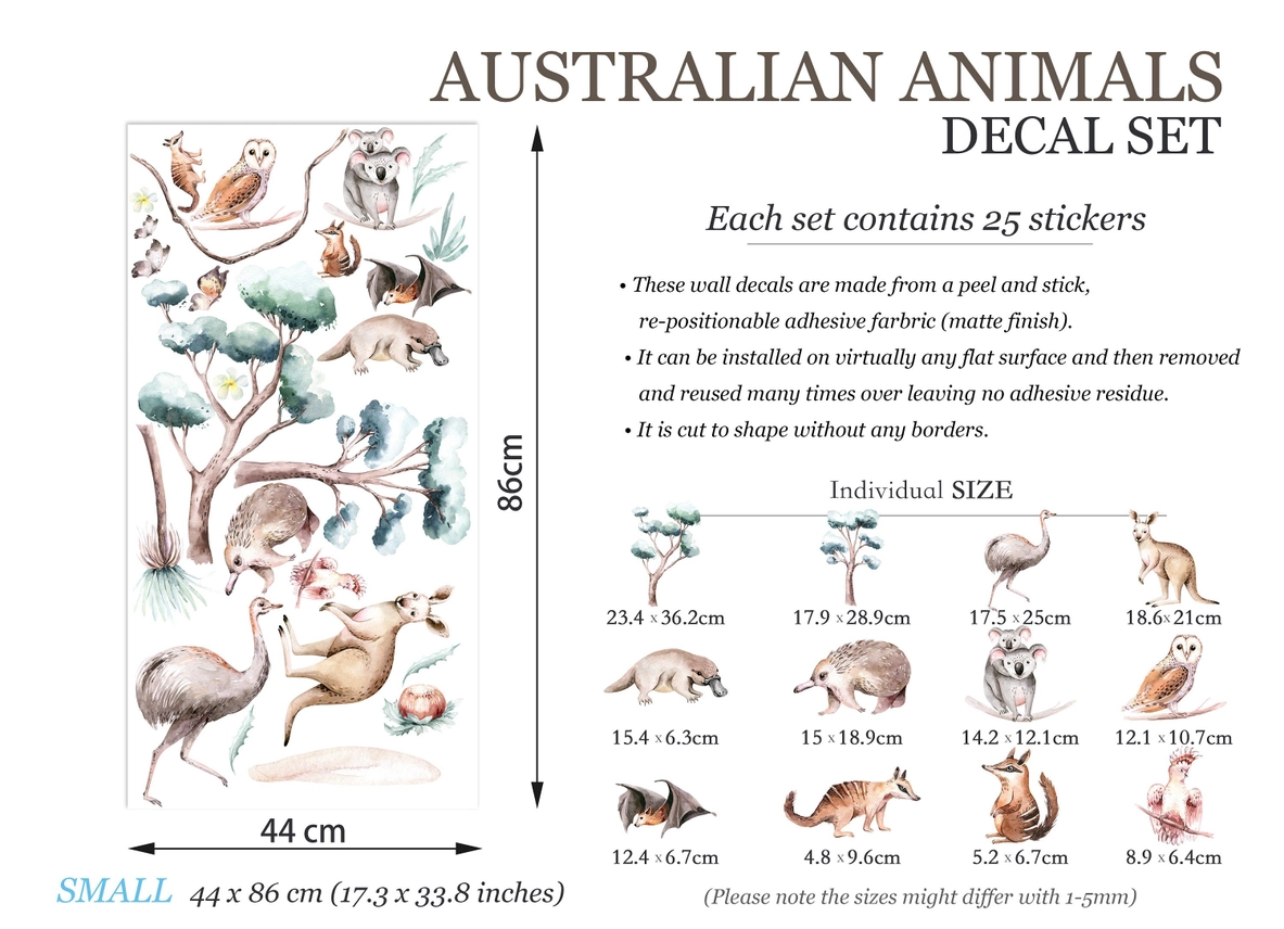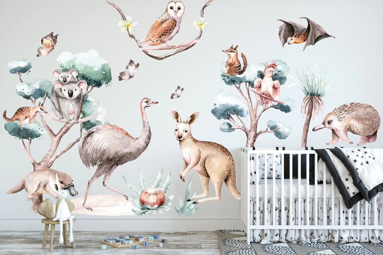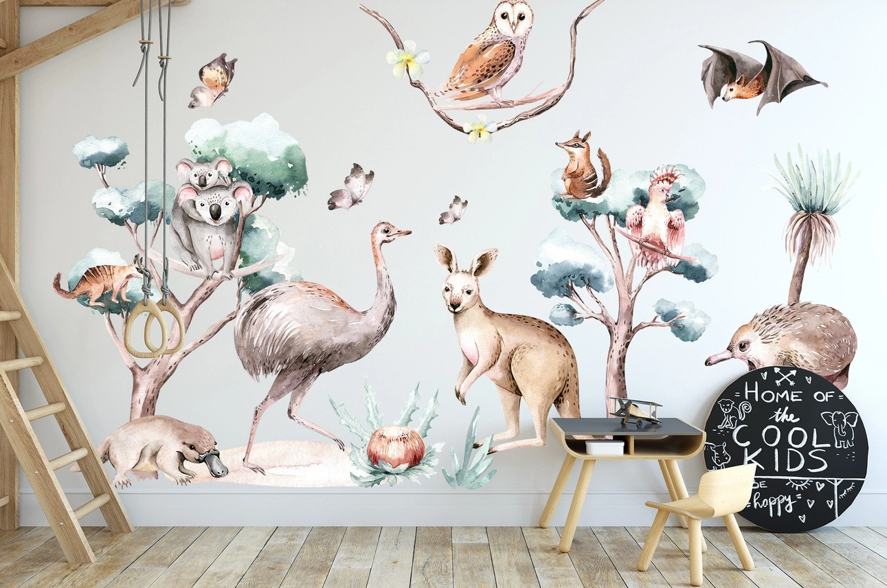 Adesivo da parete rimovibile con animali nativi australiani, canguro, koala e struzzo, ornitorinco