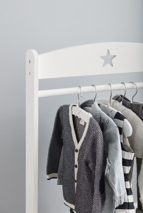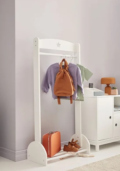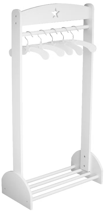 Asta appendiabiti in legno bianco del nostro concetto STAR. Può essere utilizzato per appendere i vestiti e il piccolo ripiano è ottimo per piccole scatole o scarpe. Facilmente integrabile con i nostri ganci STAR. Dimensioni 60x30x120 cm