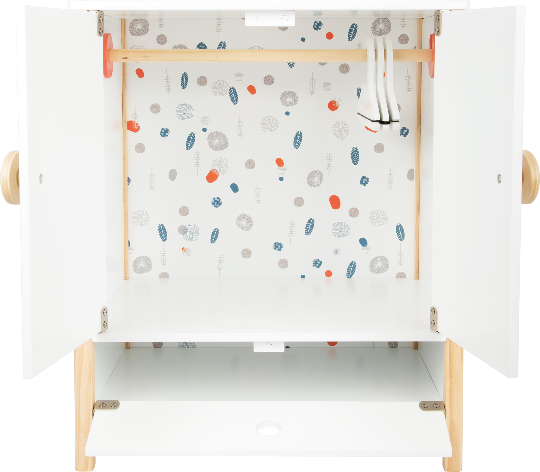 Armadio per bambole Ecco come avere tutti i vestiti per le bambole a portata di mano! Questo spazioso armadio in legno è caratterizzato da porte battenti facili da aprire, design scandinavo semplice, dagli elementi semplici e naturali! Appendiabiti e ripiano con sportello garantiscono ordine tra i vestiti delle bambole. Le grucce per abiti multifunzionali aiutano a conservare in maniera molto semplice capi di vestiario piccoli come le scarpe per le bambole e i foulard con l’aiuto di elastici. Grazie alle profondità dell’armadio ci sarà tranquillamente spazio anche per grucce più larghe. Un mobile per bambole moderno con elementi in legno…