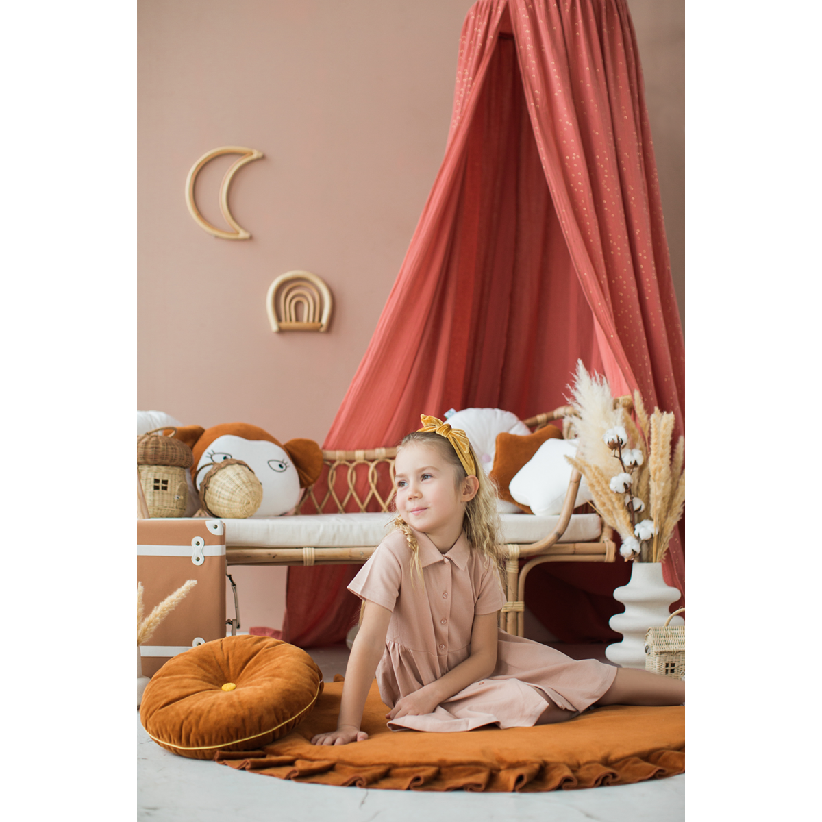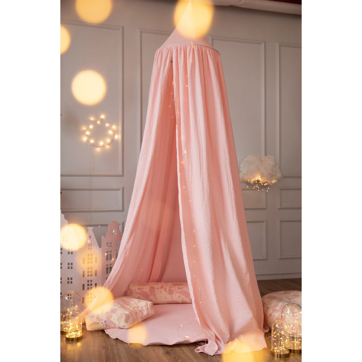 Baldacchino in doppia garza. Realizzato in tessuto leggero e traspirante con un drappo estremamente elegante e sofisticato, il nostro baldacchino è un’aggiunta magica allo spazio del tuo piccolo, sia sopra il letto che come divertente accento della stanza dei giochi. Hai notato dei piccoli puntini dorati su tutto il baldacchino? Ti porta quella piccola magia ogni giorno! Le nostre tettoie sono realizzate in cotone STANDARD 100 by OEKO-TEX® e contribuiscono a un’elevata ed efficace sicurezza del prodotto per i bambini. Adoriamo questo tessuto per la sua mano morbida e la consistenza frizzante, pur essendo molto lussuoso. Prodotto localmente in Lettonia…