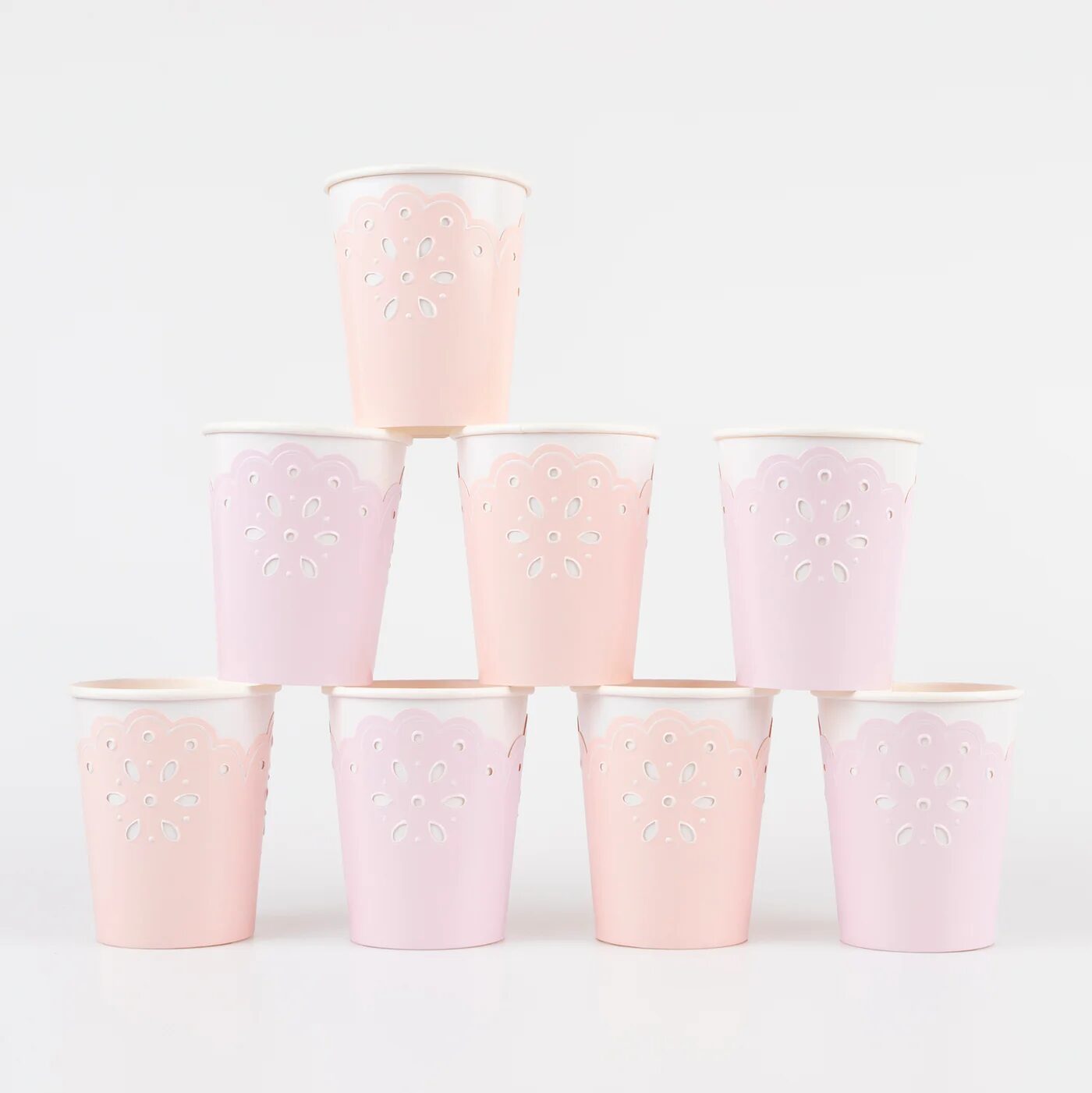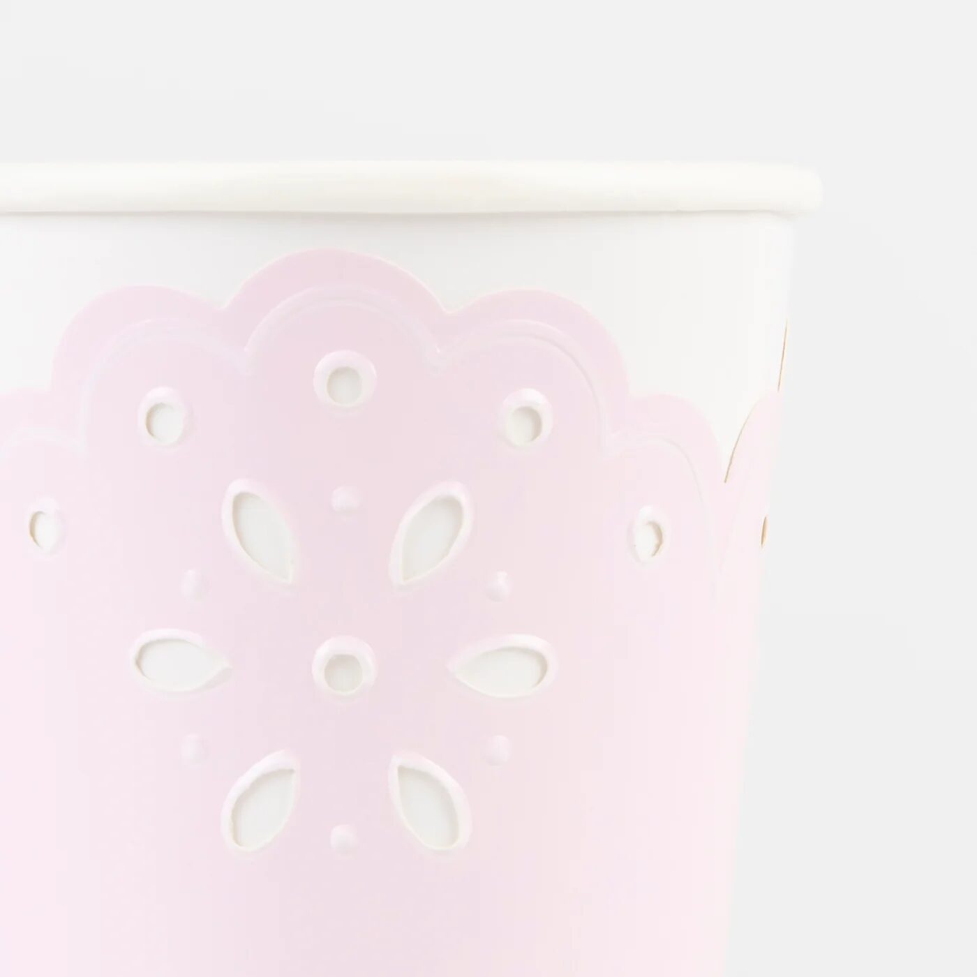 Questa graziosa gamma per feste si ispira al sangallo, un delicato ricamo con occhielli in pizzo che è tornato di moda. Abbinata ai colori rosa e pesca e ai dettagli in rilievo, questa è la gamma perfetta per addii al nubilato e baby shower. Questi bicchieri di carta sono ideali per servire speciali bevande calde o fredde per le feste.
