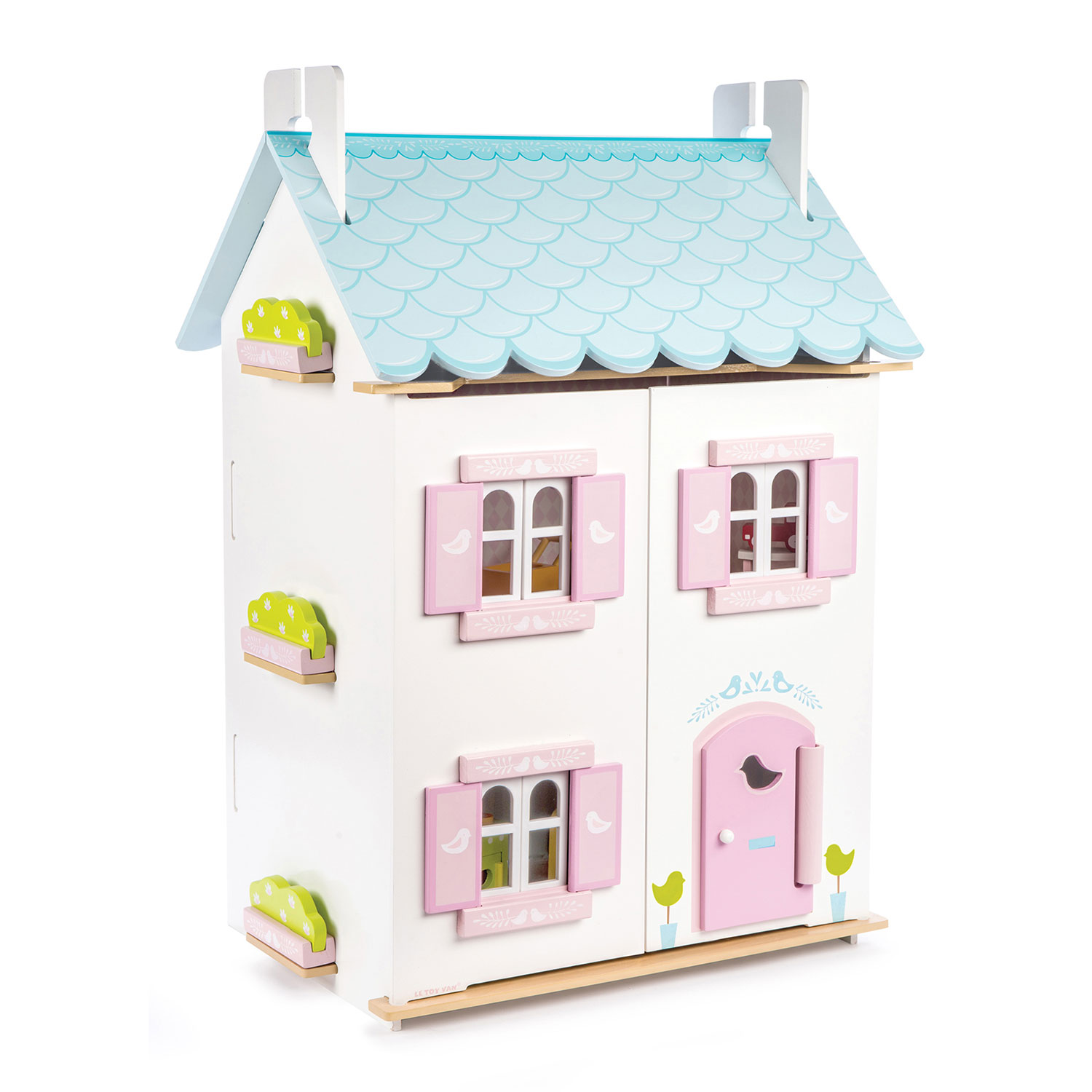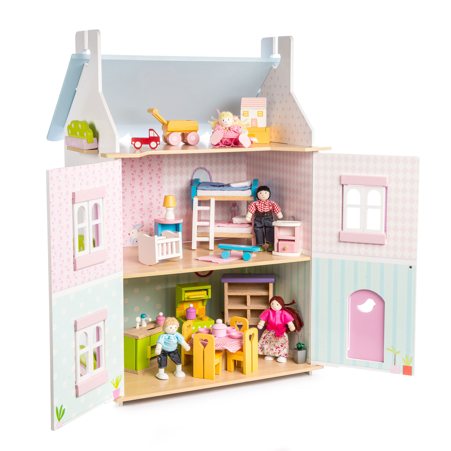 Blue Bird Cottage (mobili inclusi): casa dolce casa. Il Blue Bird Cottage è una casa delle bambole in legno completamente dipinta e decorata sul tema dell’uccello blu, utilizzando una tavolozza di colori tenui pastello blu, rosa e bianco fresco. Le caratteristiche includono l’apertura e la chiusura di persiane, finestre, tetto e porte. Interni dettagliati con divisione dei colori al piano di sopra/sotto, carta da parati diversa e belle illustrazioni in ogni stanza. La casa viene fornita completa di un set di mobili e accessori da 37 pezzi. Ridimensionato per le bambole e gli accessori Le Toy Van. La bambola è…