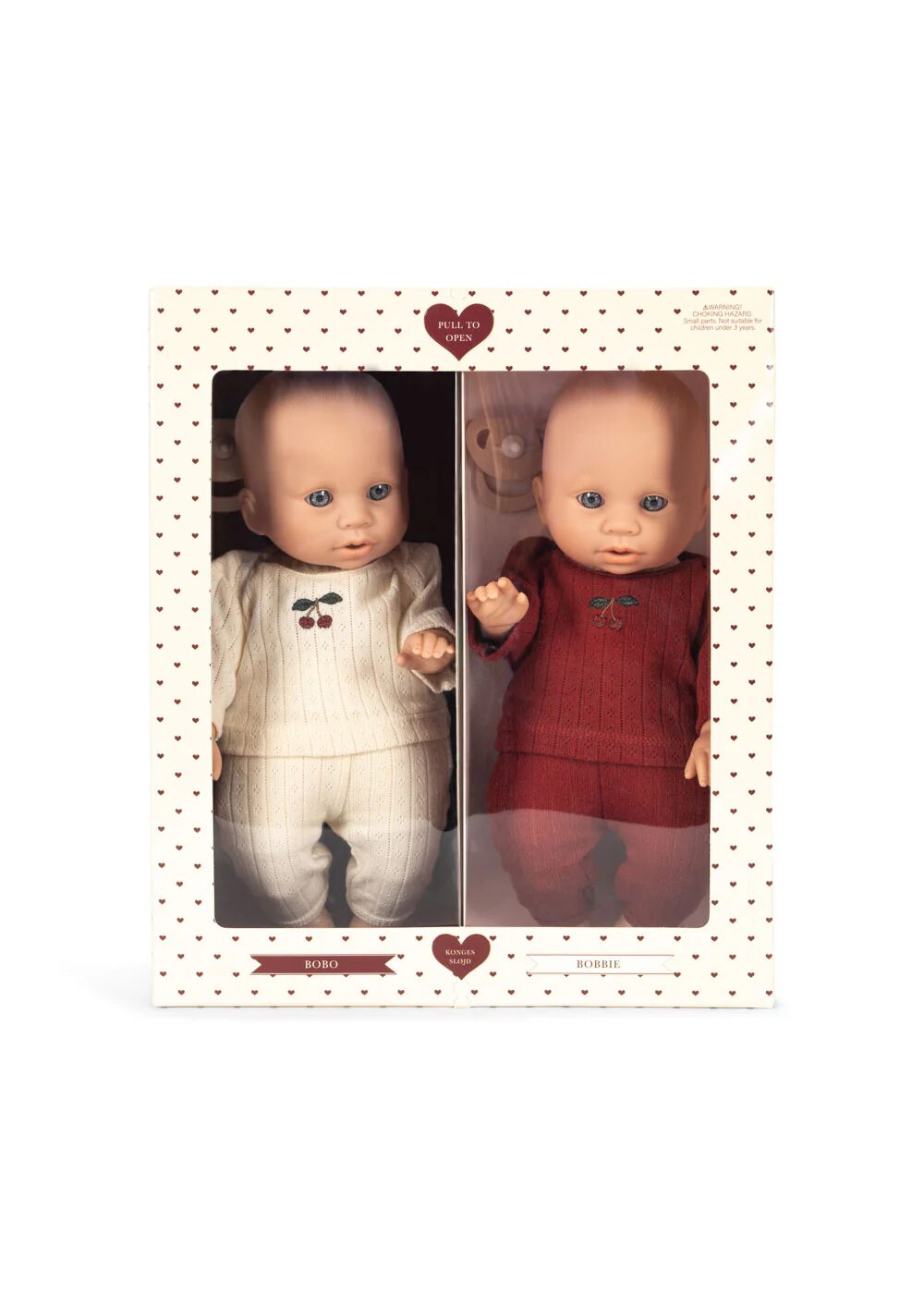 Un dolce set di bambole con i nostri amici Billy e Bobbie in un comodo pacchetto da 2 di Konges Slojd. Il regalo ideale per i genitori di bambole.