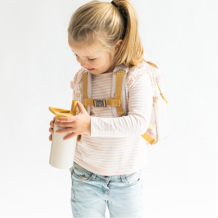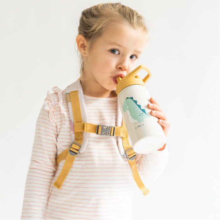Dispone di un pratico sistema con cannuccia retrattile (include anche una cannuccia di riserva) che incentiva l’autonomia e di coperchio con chiusura ermetica