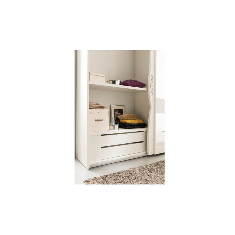 Dimensioni: Armadio bianco L267xP67xH242 Letto contenitore cm. 224 X 223 X 134 h cm. Comò 4 cassetti 119 X 49 X H 79 cm. Comodino 2 cassetti 60 X 39 X H 57. Specchiera cm. 119 x 6,5 x 86 Cassettiera interna 123x55x42h cm. Colore bianco larice