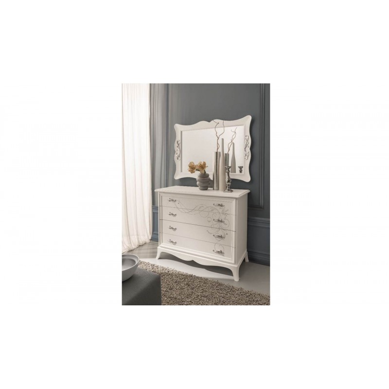 Comò 4 cassetti con guide metalliche e frontali impreziositi da decoro.
