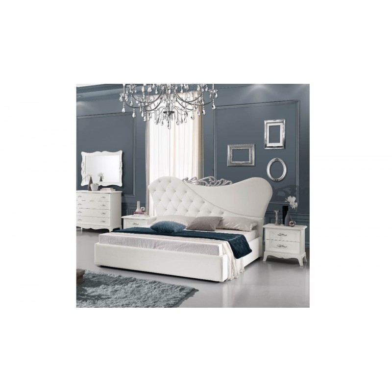 Letto matrimoniale con testata imbottita, con fregio colore argento e parziale lavorazione capitonné.