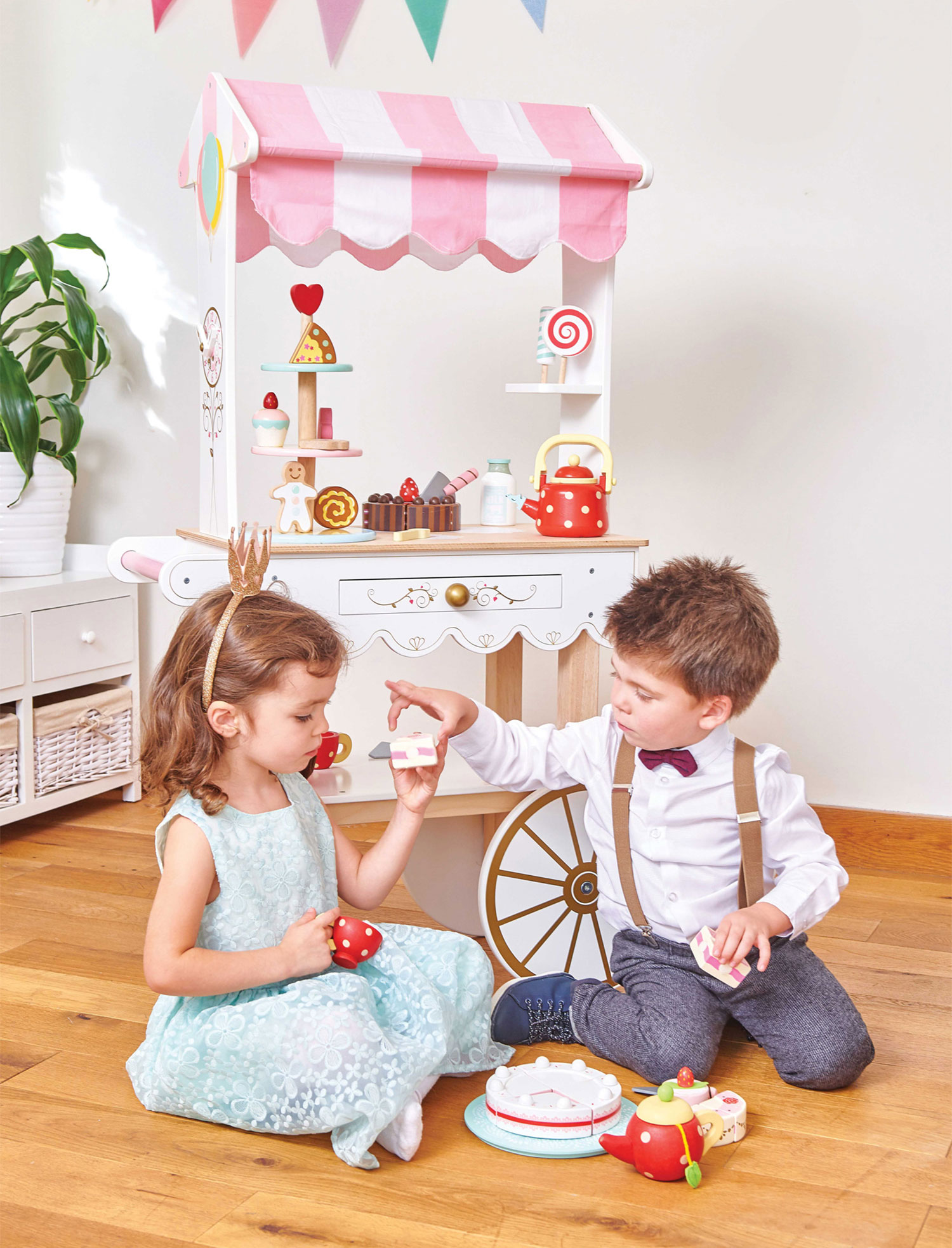 Carrello dei gelati: un classico camion dei gelati a due ruote con un tettuccio in tessuto a righe. Dispone di una porta scorrevole per lo scomparto congelatore illustrato con i classici gusti di gelato. Il set comprende 2 coni gelato magnetici. (Articoli aggiuntivi disponibili separatamente) Assemblaggio fai-da-te. Dimensioni: L 68,5 x P 32,5 x H 114 cm Età: dai 3 anni.