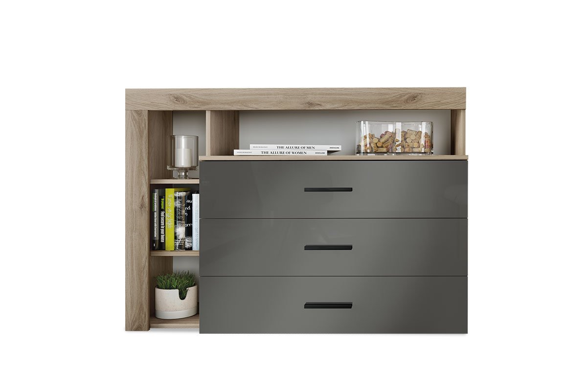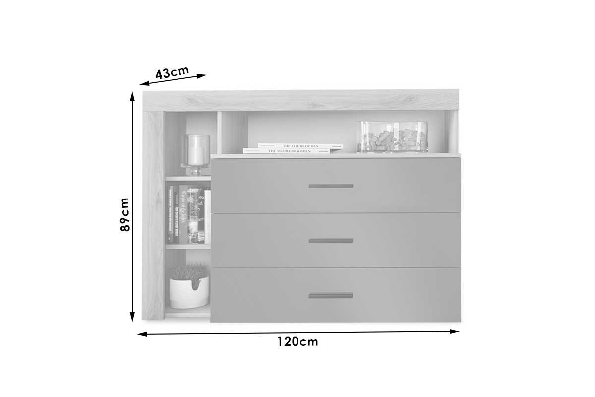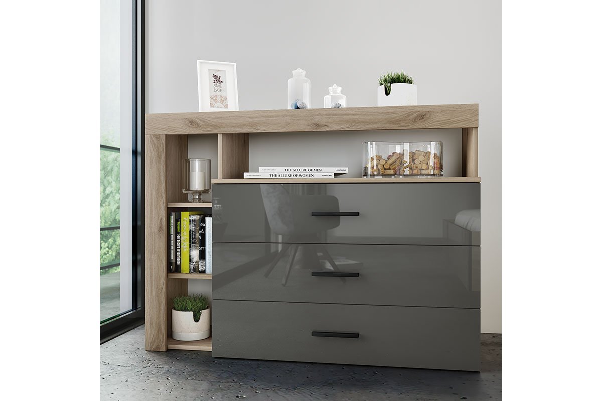 CASSETTIERA con tre cassetti e ripiano in colore antracite lucido 120x43x89 cm Stai cercando una serie innovativa con un design giovane e impressionante e una combinazione di colori distinta? Con più aree di archiviazione e un’elevata qualità costruttiva? Smetti di cercare perché questa cassettiera è fatta apposta per te. Sceglilo e rinnova il tuo spazio secondo le ultime tendenze della stagione. Caratteristiche tecniche: * Realizzata in truciolare rivestito con melaminico di alta qualità, con resistenza alle sollecitazioni e al tempo. È offerto nella combinazione di colori naturale-carbone lucido (lucido). Ha tre ampi cassetti e un ripiano perimetrale per riporre i tuoi…