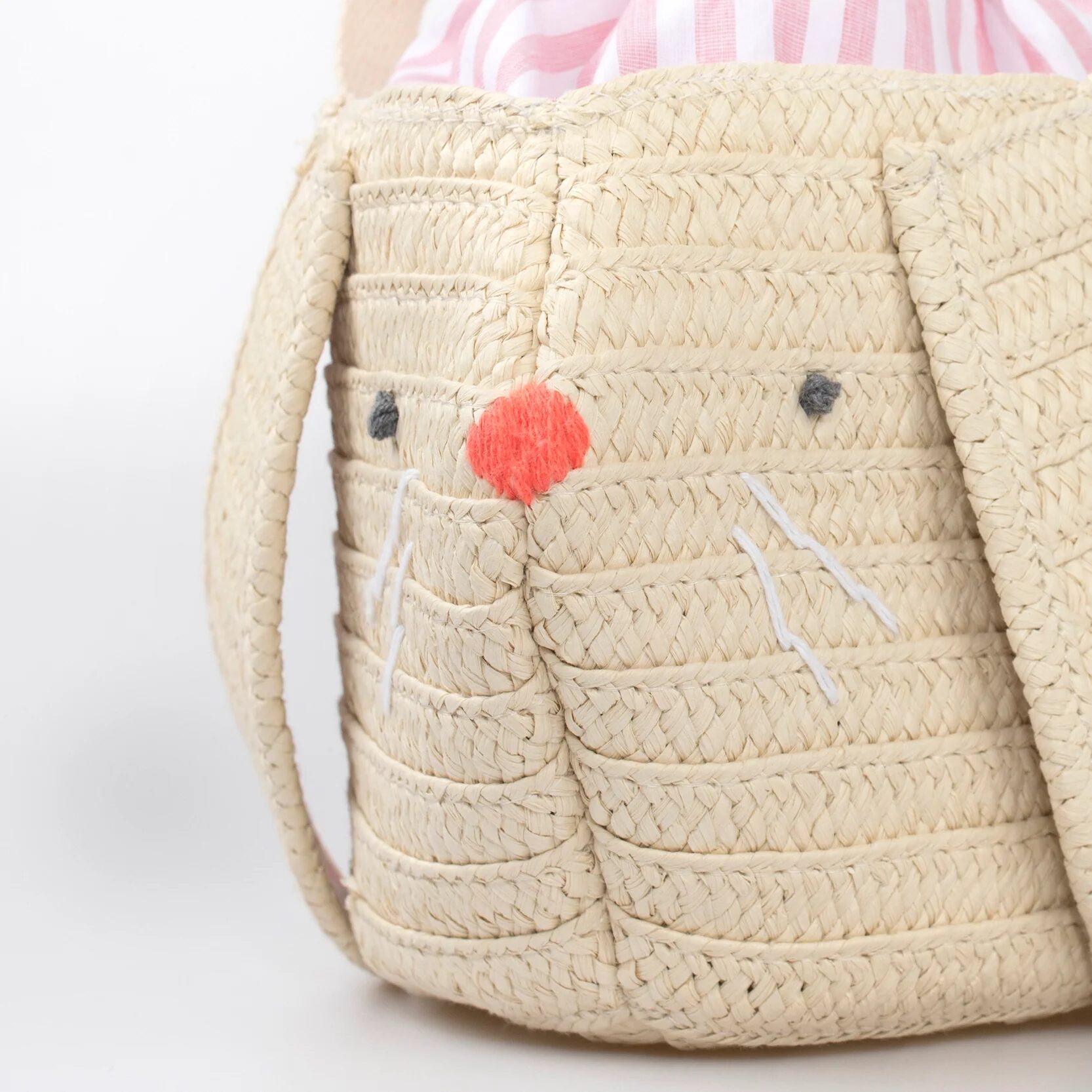 Questo cestino per coniglietti è splendidamente realizzato con molta attenzione ai dettagli: orecchie a righe, una faccia ricamata, una simpatica coda pompon e un interno con coulisse a righe rosa. È la dimensione perfetta per raccogliere uova di Pasqua o trasportare oggetti essenziali in qualsiasi momento dell’anno.