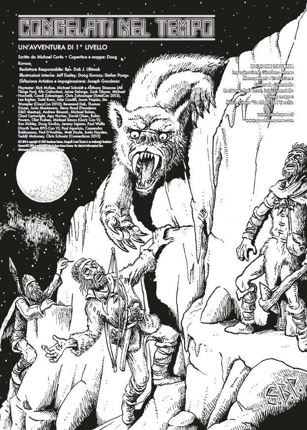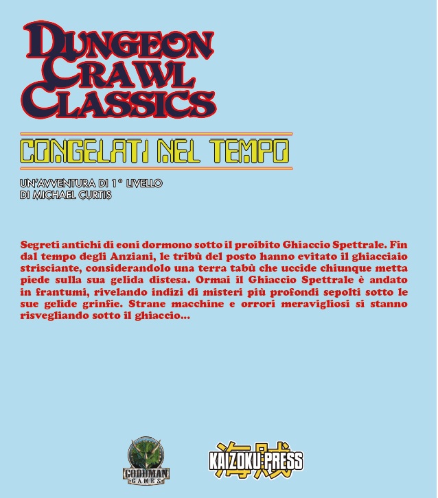 CONGELATI NEL TEMPO Avventura per 5 personaggi di 1° Livello per Dungeon Crawl Classics, il GdR Old School Tipo prodotto: Avventura Formato: A4, 24 pagine Prezzo: 15 Euro Lingua: italiano ISBN: 9788882925659 Editore: Kaizoku Press