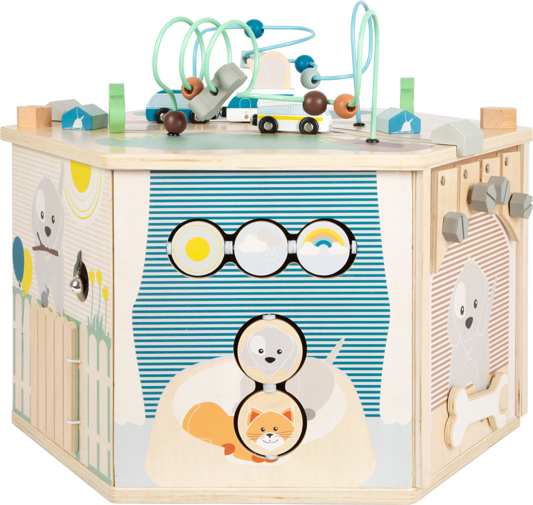 Descrizione Giocabile su 8 lati, questo cubo da gioco offre un divertimento duraturo e insegna com’è la vita con gli animali domestici! Le capacità motorie vengono allenate tramite il labirinto scorrevole, il gioco ad incastro, il gioco con gli sportelli girevoli e il gioco di assegnazione dei colori rimovibile, sempre in tema con la vita quotidiana degli animali! Il gioco di costruzione con viti e attrezzi incoraggia la destrezza, mentre il campanello/sonaglio della porta stimola la percezione acustica. Il punto forte è il coperchio reversibile con lavagna sul retro, che può essere fissato senza attrezzi e che con i suoi…