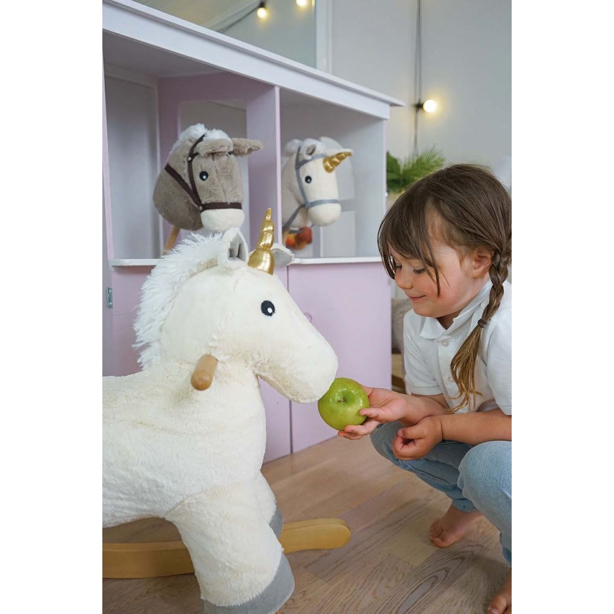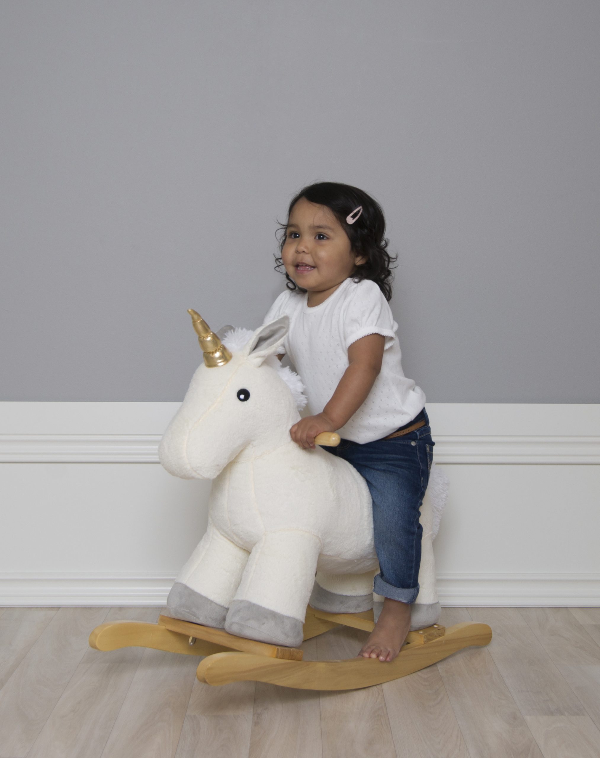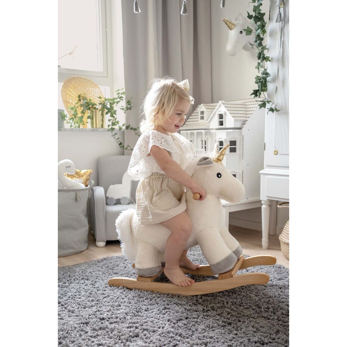 Descrizione Simpatico animale a dondolo a forma di unicorno. Parti per avventure emozionanti con il tuo nuovo amico. L’unicorno è morbido e comodo su cui sedersi e ha due impugnature facili da impugnare. Perfetto come regalo di battesimo. Particolari Corno oscillante con cui tuo figlio può giocare, cavalcare e armeggiare. Scivoli antiribaltamento in legno. Peso massimo 30 kg Colore: Bianco Età: Da 1 anno Materiale: Legno, peluche Confezione: 55 x 28 x 48 cm Misurare: 67 x 27 x 60 cm EAN: 7332599140502