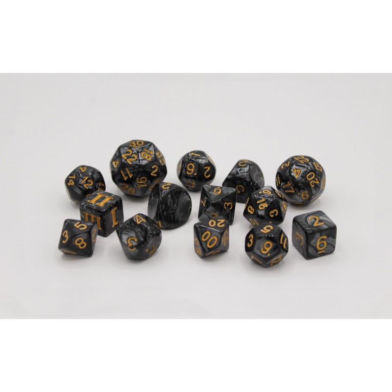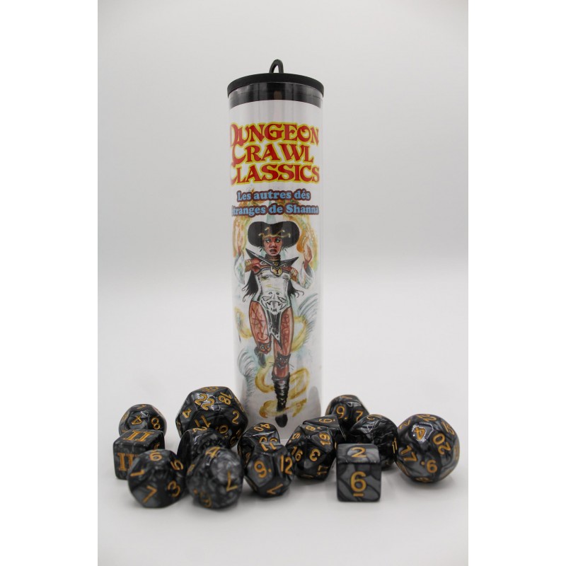 I Dadi di Shanna sono un set ufficiale prodotto da Impact! Miniatures per DCC. Nel tubo che li contiene c’è anche un inserto con un’illustrazione di Doug Kovacs e la descrizione in italiano di una nuovissima creatura per DCC creata da Harley Stroh. Il set contiene 14 dadi color nero marmorizzato: d3, d4, d5, d6, d7, d8, d10, d%, d12, d14, d16, d20, d24, d30