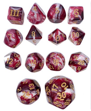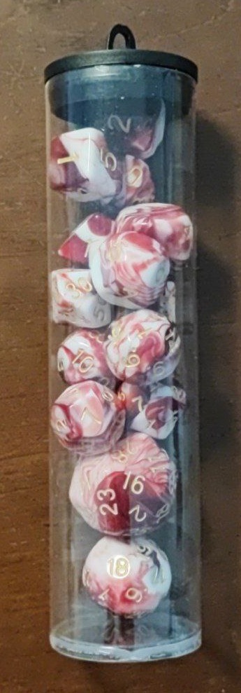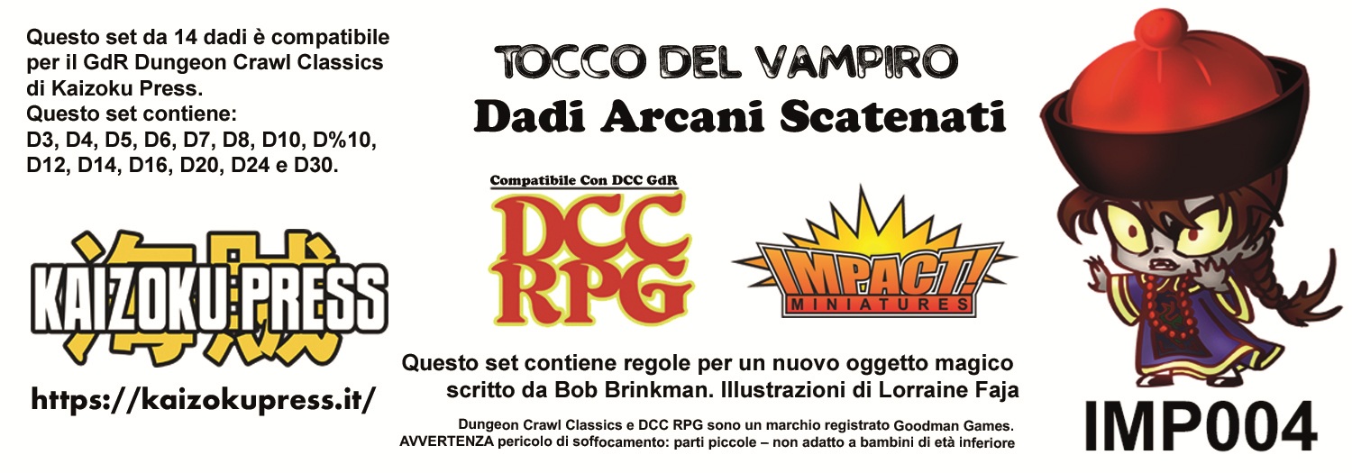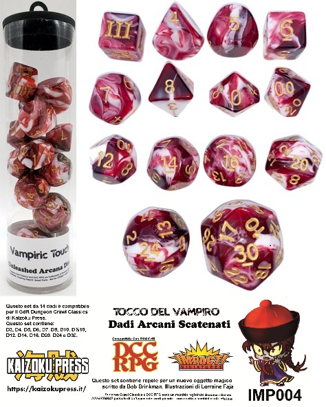 I Dadi Tocco del Vampiro sono un set ufficiale prodotto da Impact! Miniatures per DCC. Nel tubo che li contiene c’è anche un inserto con un’illustrazione di Lorraine Fajardo e la descrizione in italiano di un mostro inedito per DCC creato da Harley Bob Brinkman. Il set contiene 14 dadi “sanguinolenti”: d3, d4, d5, d6, d7, d8, d10, d%, d12, d14, d16, d20, d24, d30