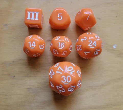 Questo set di Dadi color Arancione contiene i 7 dadi strambi per Dungeon Crawl Classics da usare assieme ai più classici “poliedri standard”. Il set da sette (ahah!) contiene: d3, d5, d7, d14, d16, d24 e d30