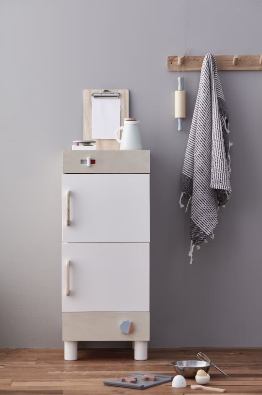 I bambini si divertiranno a riporre la spesa con tutti i soliti scomparti che si trovano nel frigorifero di casa. 2 ripiani interni delle porte, uno contenente 2 portauova e un cassetto aggiuntivo nella parte inferiore per le verdure e la frutta. Interruttore scorrevole per regolare la temperatura del frigorifero Un pulsante di accensione/spegnimento con suono di clic. Il giocattolo richiede il montaggio da parte di un adulto. Dimensioni 30x30x73 cm