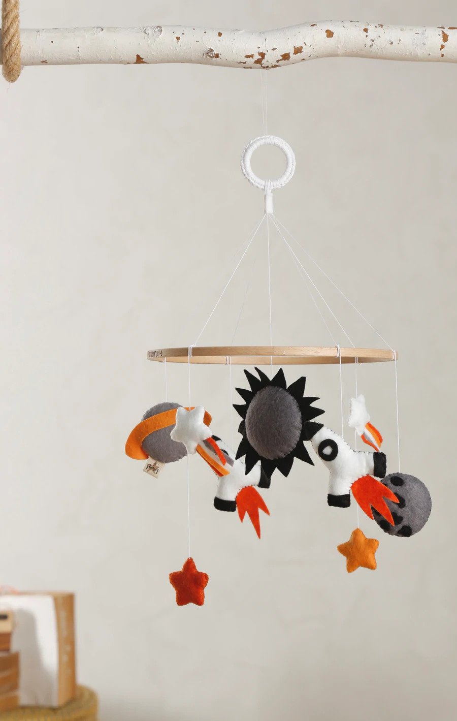 La giostrina spaziale con i suoi bei colori è semplicemente una bomba! Moderna che si adatta agli spazi moderni. È composto da un sole, due pianeti, due razzi, 2 stelle e 2 comete. Ogni prodotto è unico perché realizzato a mano, quindi possono differire l’uno dall’altro. Materiale: Feltro, Fibra Misura: Diametro: 21,5 cm, H: 40 cm Colore: Bianco, Grigio, Nero, Rosso Scuro, Arancio Istruzioni di lavaggio: Si consiglia di pulirlo con un panno umido.