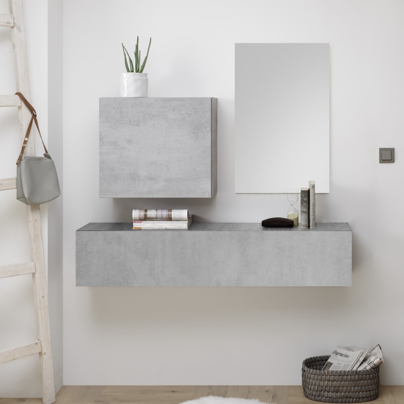 Mobile ingresso Yuma beton è una composizione interamente sospesa caratterizzata da linee geometriche e pensata per accontentare il desiderio di un arredamento moderno e pratico. Essa è composta da una ribalta senza maniglia, un cubotto con un’anta dotato di guide e cerniere in metallo, e una specchiera dello spessore di 2 cm. Finitura: beton Dimensioni singoli elementi: Cubotto: L55xH50xP30cm Ribalta senza maniglia: L138xH29xP30cm Specchiera: L50xH80xP2cm