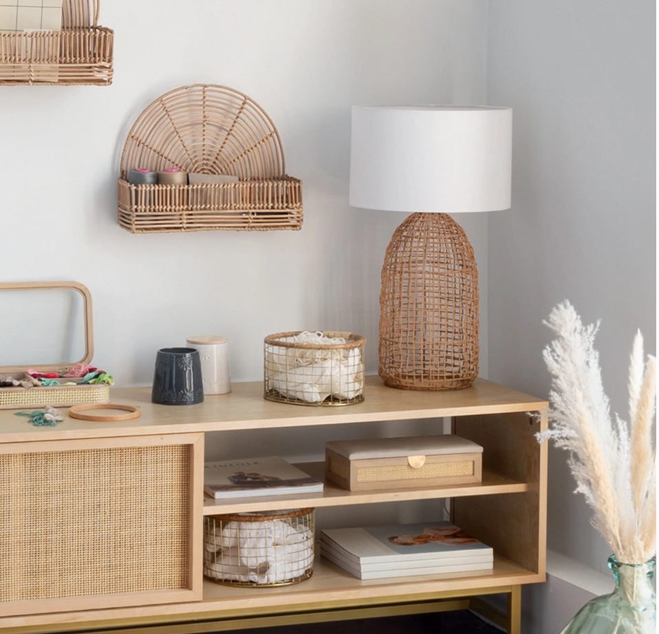 LAMPADA KARLA Per dare uno stile etnico chic ai tuoi interni, la lampada “Karla” è l’accessorio decorativo di cui hai bisogno. Un mix di materiali Questa lampada combina una base in rattan intrecciato con un paralume in misto cotone per un contrasto sorprendente che darà carattere alla tua decorazione. La base dal design grezzo e naturale dona alla lampada “Karla” un tocco artigianale che invita a viaggiare. Le forme si combinano per creare un insieme armonioso che donerà un fascino innegabile alla tua stanza. Un’illuminazione pratica e originale Questo apparecchio si adatta facilmente a qualsiasi interno grazie a una miscela…