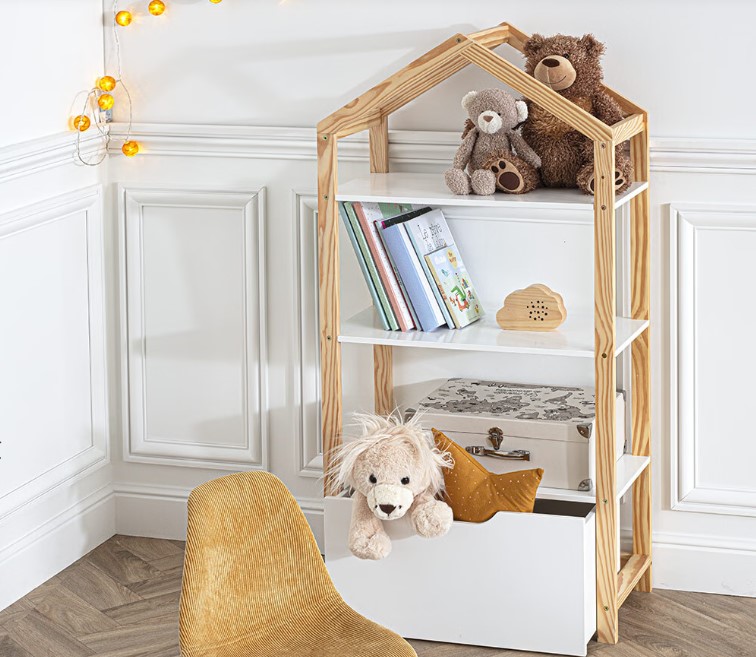 Cerchi una bella libreria per la cameretta del tuo bambino? La biblioteca per bambini CASA DOLCE CASA ha tutto di cui hai bisogno! Libreria per bambini in legno E’ una libreria in legno di pino, dotata di ripiani e cassetti in fibra di legno. Si tratta quindi di un’autentica libreria, che delizierà la cameretta di un bambino rivestito di pannelli e dotata di mobili in legno. Pratica libreria dotata di tre ripiani e di un cestino portaoggetti, la libreria in legno ti offre la possibilità di riporre tutti i libri del tuo piccolo, ma anche tanti oggetti, come giocattoli, coperti…
