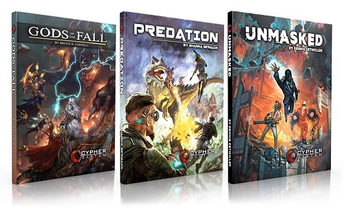 Qualcosa di UNICO: Le tre ambientazione nell’universo Cypher System. 2 sono in formato stampa: PREDATION E GODS OF THE FALL, in un fantastico BUNDLE SPECIALE LIMITED, racchiuse nella box a tiratura limitata. In formato solo eBook UNMASKED e il manuale base del Cypher.