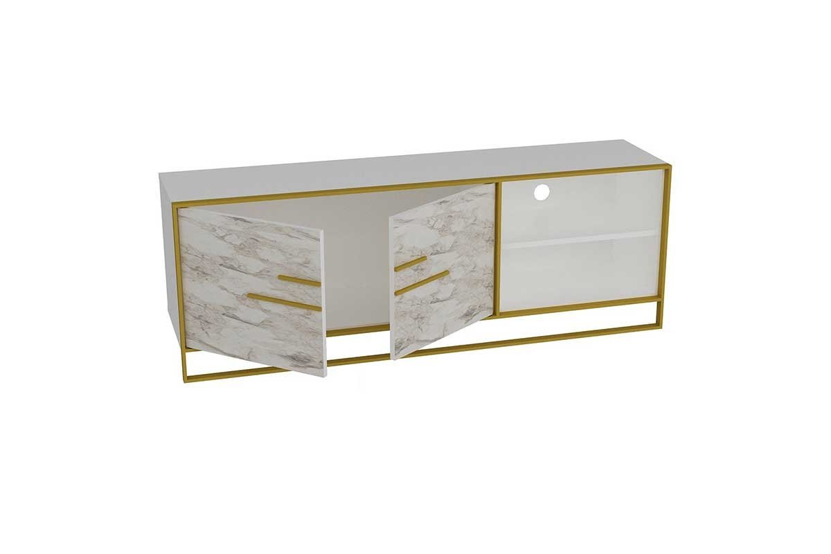 Mobile TV MARMO ORO colore bianco marmo-oro 160×38,5×56,5cm Cerchi un mobile TV che si distingua dall’ordinario? Questo mobile moderno migliorerà l’estetica del tuo spazio, offrendoti allo stesso tempo spazio per riporre oggetti utili. Una proposta di decorazione originale per le vostre aree di ricevimento. Caratteristiche tecniche: * Costruzione in truciolare con rivestimento melaminico di alta qualità con resistenza alle sollecitazioni e al tempo. Proposto in colore bianco con sfumature marmo * Supporto in struttura in metallo colore oro. Dimensioni dei mobili da terra: Lunghezza: 160 cm. Larghezza: 38,5 cm Altezza: 56,5 cm. Osservazioni: Il prodotto viene consegnato smontato, nella confezione di fabbrica e con una guida di montaggio dettagliata.