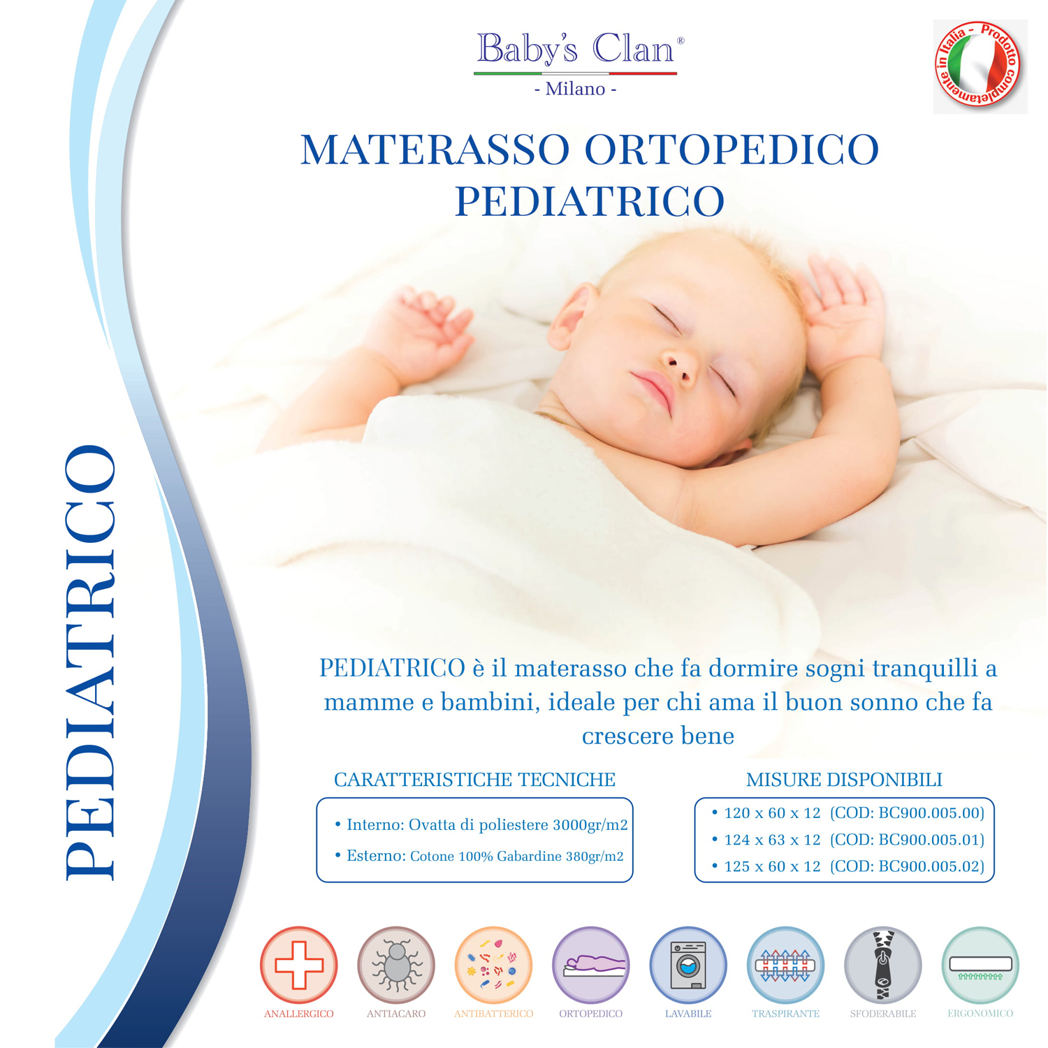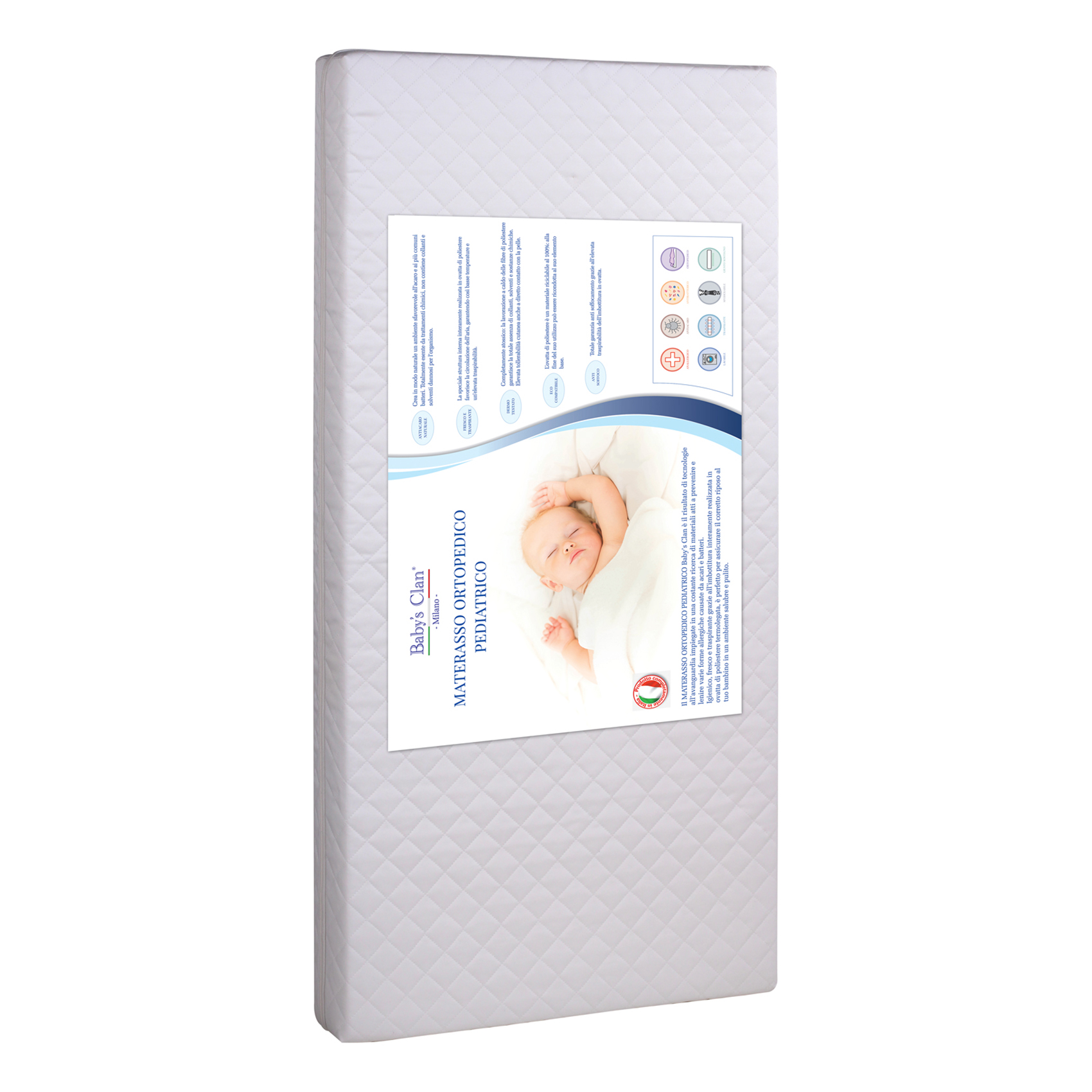 Il materasso PEDIATRICO Baby’s Clan è il risultato di tecnologie all’avanguardia impiegate nella costante ricerca di materiali atti a prevenire e lenire varie forme allergiche causate da acari e batteri.