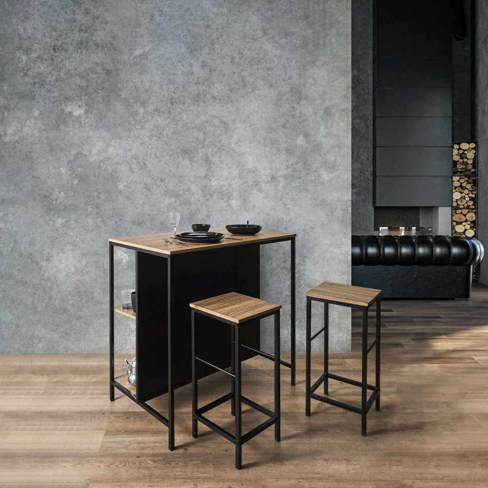 Questo tavolino rotondo e le sue due sedie dal design industriale staranno benissimo nel vostro salotto! Scoprite senza indugio questo superbo mix di stile tra legno e metallo