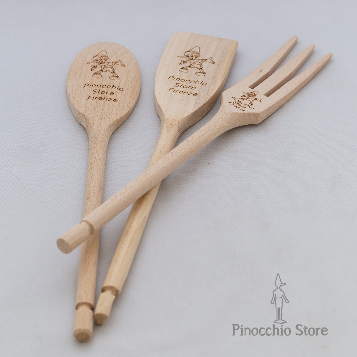 È formato da una spatola, un cucchiaio e un forchettone firmati Pinocchio Store Firenze ed è realizzato esclusivamente in legno.