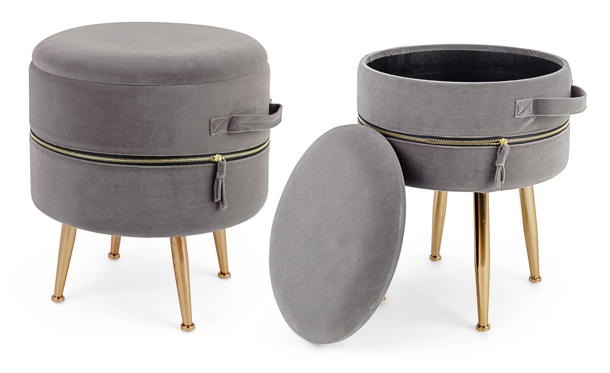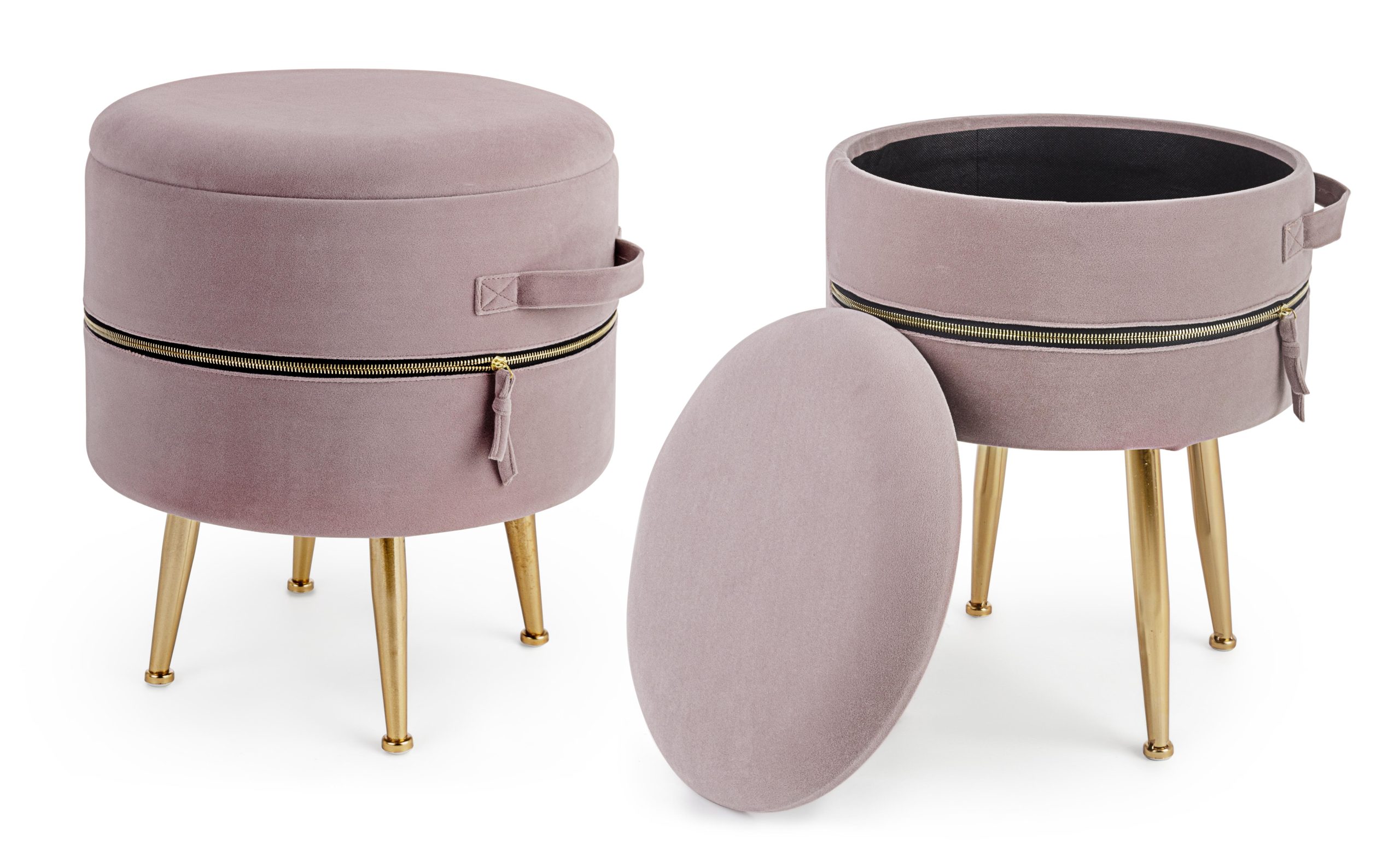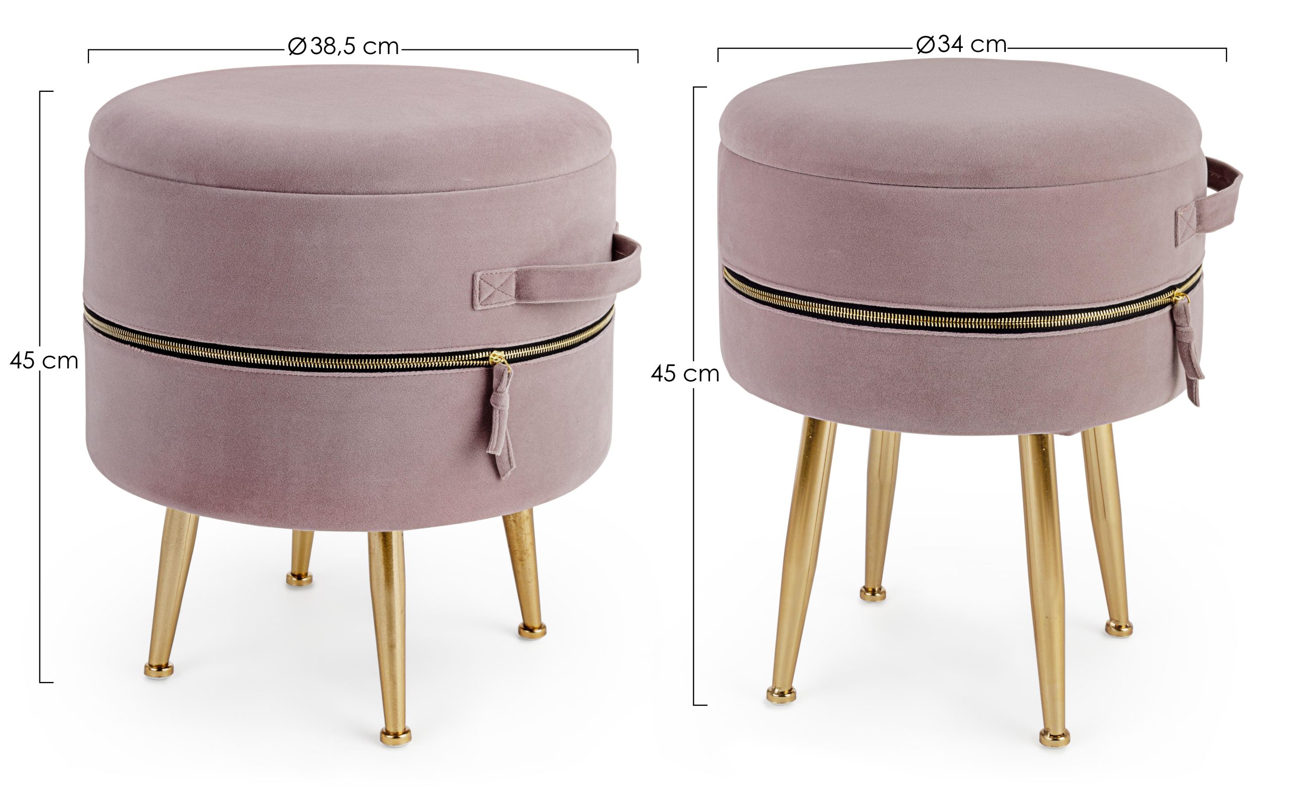 DETTAGLI Struttura in mdf e compensato. gambe in acciaio cromatura dorata. rivestimento in poliestere effetto velluto con cerniera decorativa. densita’ imbottitura 30kg/m3. gambe da assemblare. MISURE Ø34a – 45h; ø38.5a – 45h