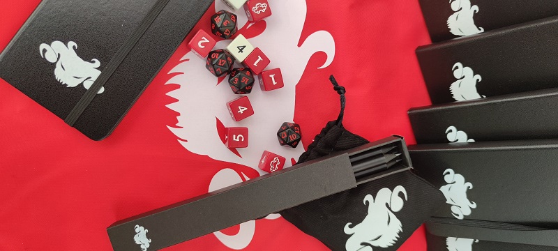 La bustina è unica, è stata stampata appositamente per noi dalla Q-Workshop. Anche i dadi sono fantastici, sempre Q-Workshop, e sono pesanti e massicci. Il Demon Lord ci osserva beffardo dalla faccia 6 del d6 e 20 del d20, ricordandoci che non si possono fare critici su Urth.