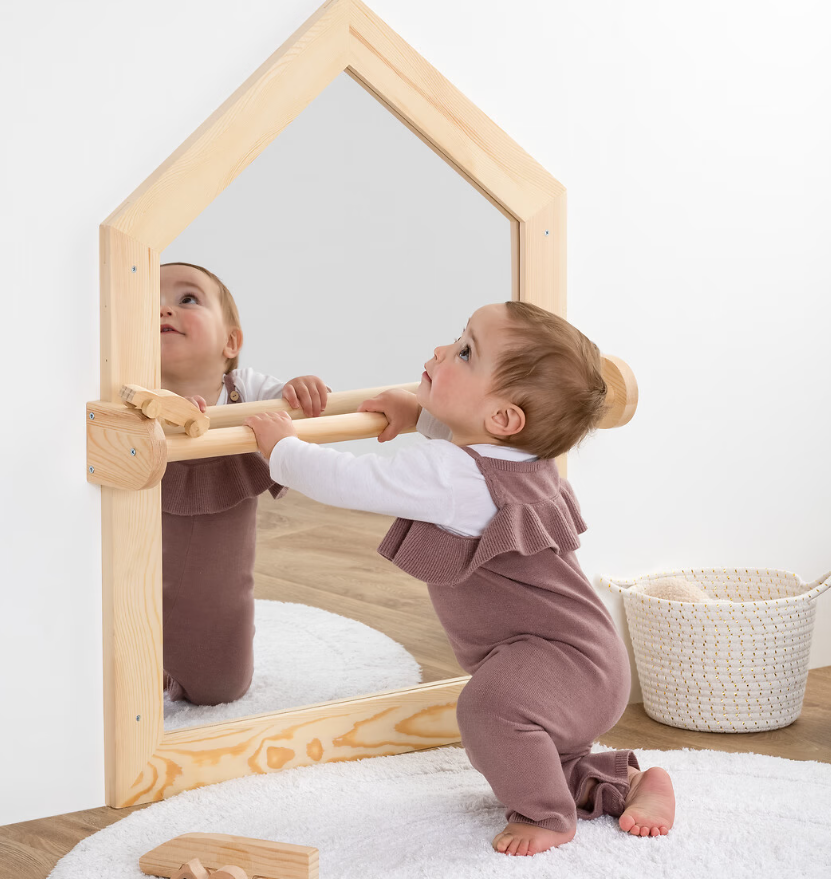 Fissa il tuo specchio in legno per bambini evolvente nella stanza del bambino in modo che sviluppi le sue capacità motorie divertendosi.
