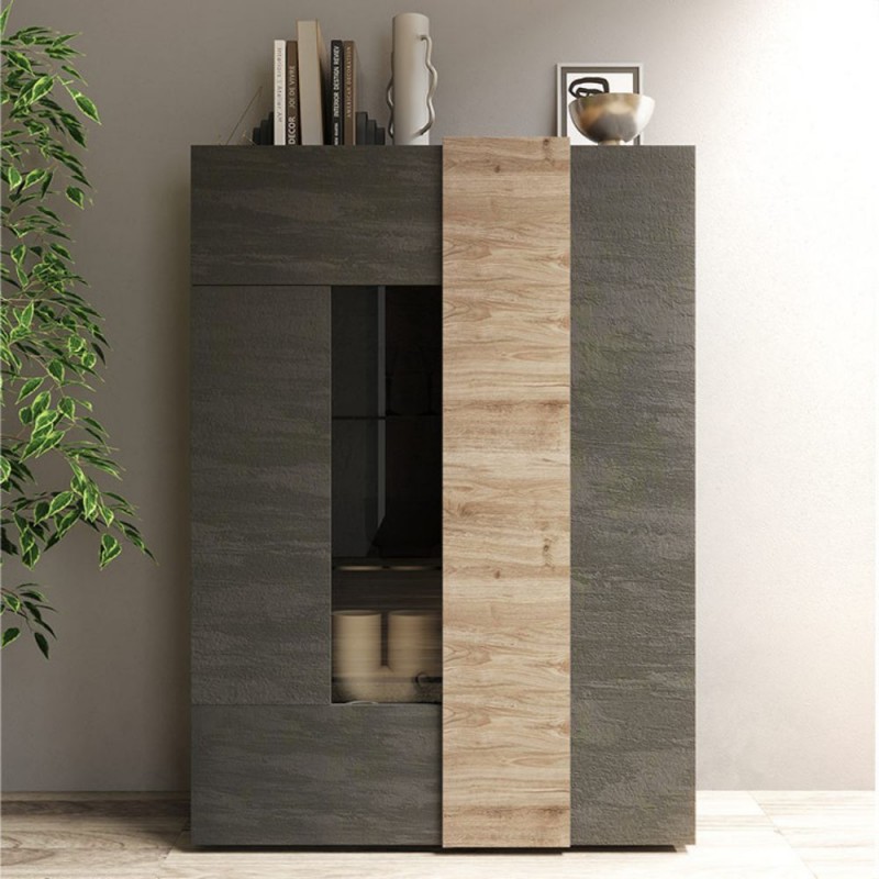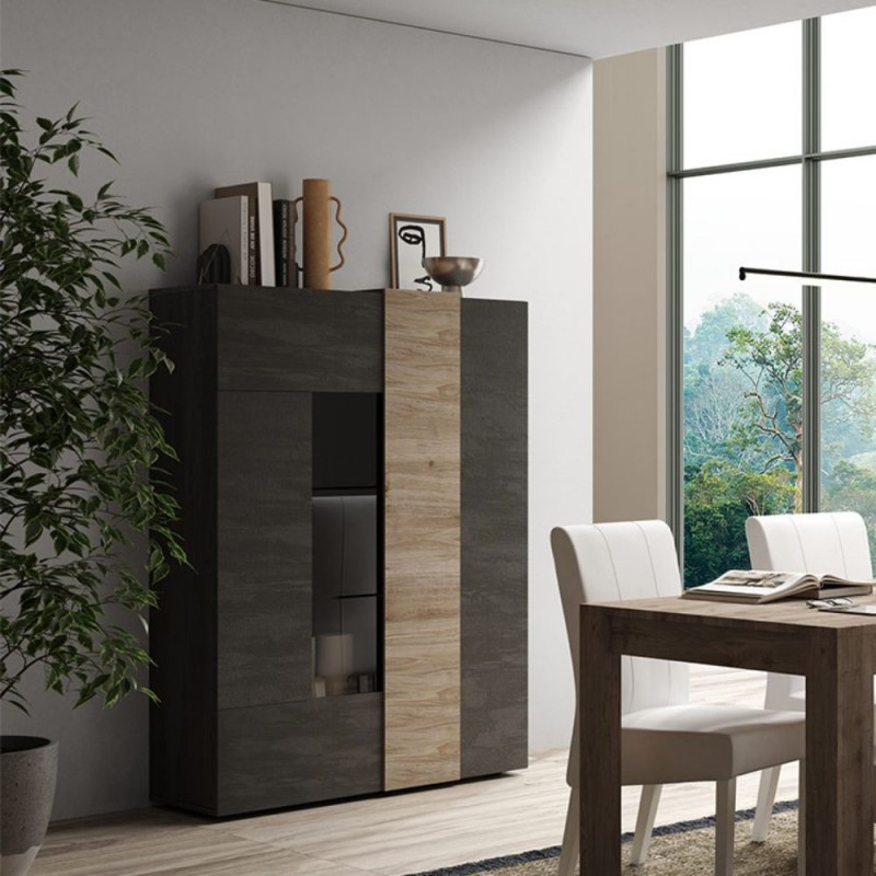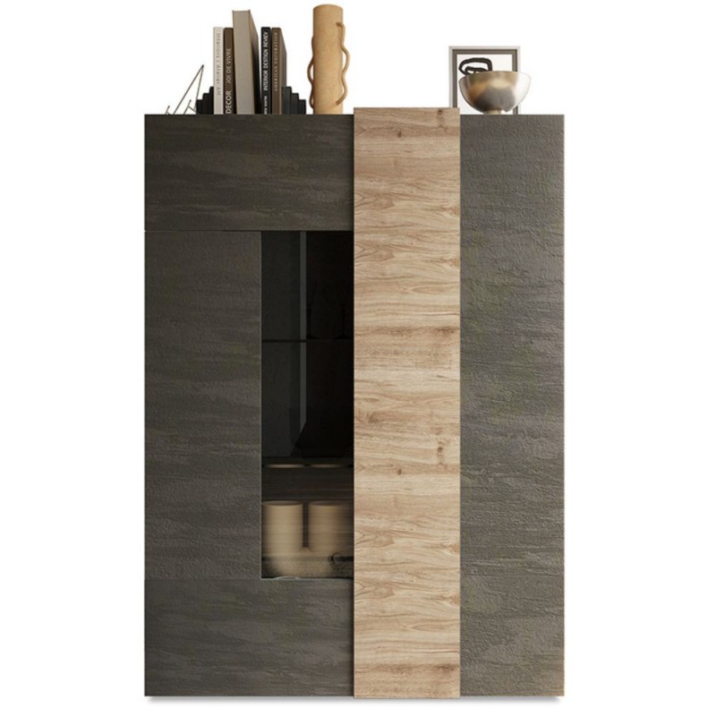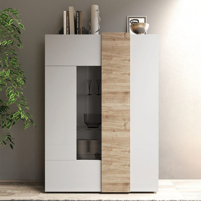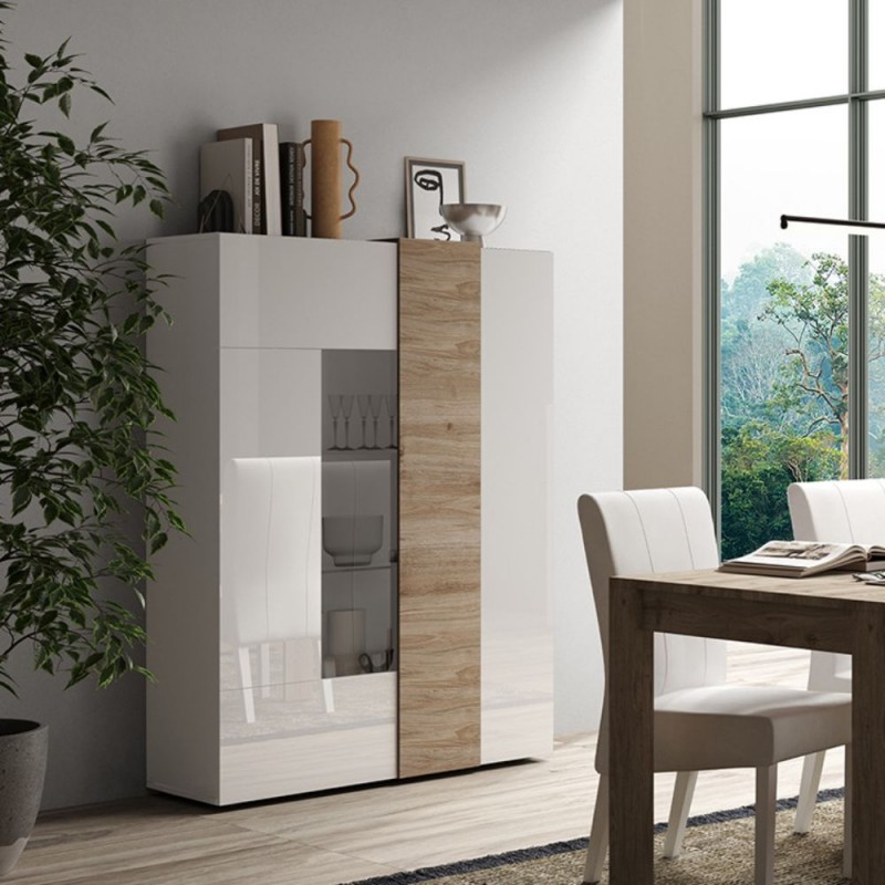 Caratteristiche: Vetrina Materiale: pannelli in melaminico alta qualità. 2 ante battenti con vetro nella parte centrale. 8 ripiani, 2 in vetro Cerniere in metallo. Spessore pannelli 16 mm. Misure: L.121 x H. 168 x P.44 cm. Finitura: bianco lucido o rovere Kadiz.