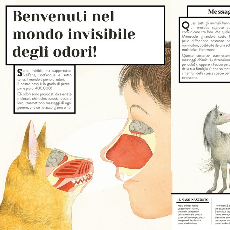 di Emmanuelle Figueras & Claire de Gastold Questo libro animato esplora in tutte le sue forme l’olfatto degli animali: come fanno ad orientarsi, a localizzare una preda, a nutrirsi oppure… a sedurre un(a) partner? Cosa fa il piccione viaggiatore per orientarsi? Come fa la talpa, quasi cieca, a calcolare a che distanza si trova il verme che costituirà il suo pranzo? Come mai i cani si annusano il didietro? Come fa la giraffa maschio a sapere che una femmina è pronta ad accoppiarsi? Queste, e molte altre domande a cui questo libro risponde in una forma quanto mai accessibile, ossia…